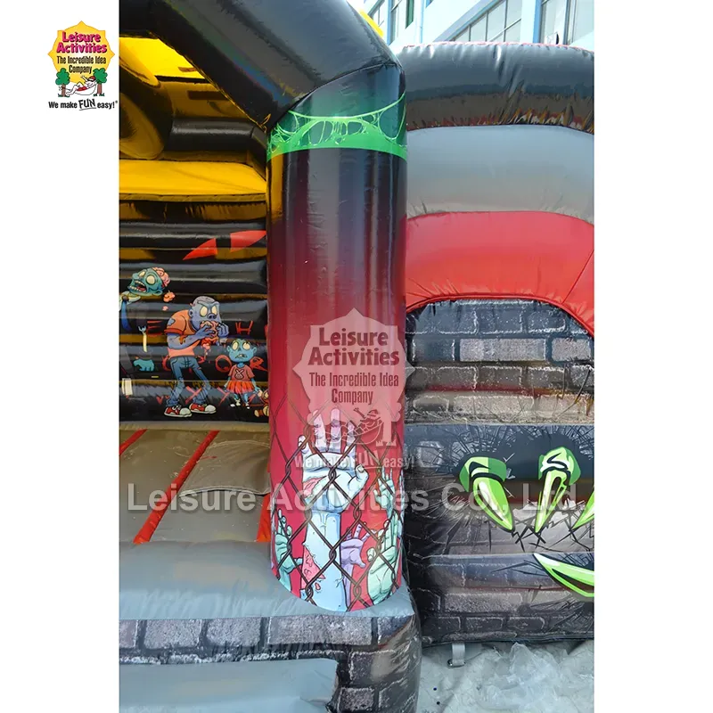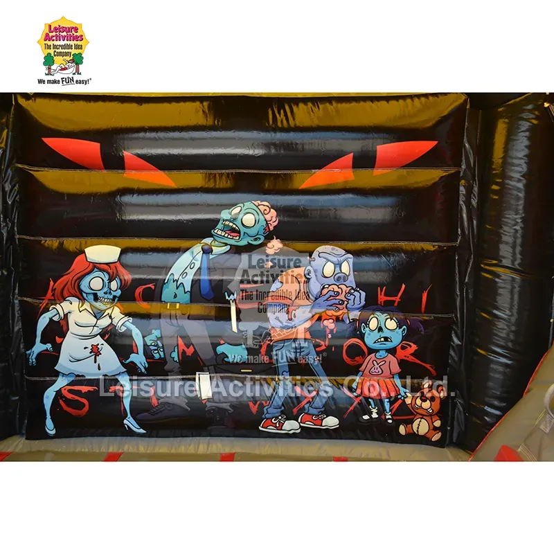 स्लाइडसह पछाडलेले छोटे इन्फ्लेटेबल मल्टीप्ले बाउंसी किल्ले: हे झोम्बीथीम असलेले "हॉन्टेड कॉम्बो" इन्फ्लेटेबल मुलांना त्याच्या रोमांचकारी कार्टून-भयपट सौंदर्याने मोहित करण्यासाठी डिझाइन केले आहे. ठळक लाल, चकचकीत काळे आणि विलक्षण हिरव्या आणि ब्लूजचे ठळक संयोजन एक ज्वलंत, रोमांचक वातावरण तयार करते. डायनॅमिक पोझमध्ये कार्टून झोम्बींचे मोठे, खेळकर ग्राफिक्स—जसे की एक परिचारिका, मेंदू खाणारे पात्र आणि टेडी बेअर असलेले झोम्बी किड—भयावण्यापेक्षा अधिक मजेदार आहेत. छतावर रेंगाळणारा मोठा निळा झोम्बी, भिंतीतून फुटणारे नखे आणि स्तंभांवरील साखळ्या/ग्राफिक्स यांसारखे परस्परसंवादी घटक कल्पनारम्य खेळाला सुरुवात करतात. संरक्षक शीर्ष कव्हर असलेली बंद रचना सावली आणि हलक्या पावसापासून संरक्षण देते, तर संलग्न स्लाइड साहसीपणा वाढवते. 10 फूट उंचीमुळे ते इनडोअर आणि आउटडोअर दोन्ही वापरासाठी अष्टपैलू बनते, हेलोवीन पार्ट्या, फॉल फेस्टिव्हल, थीमवर आधारित वाढदिवस इव्हेंट्स आणि घरामागील अंगणातली मस्ती उत्तम प्रकारे बसते.